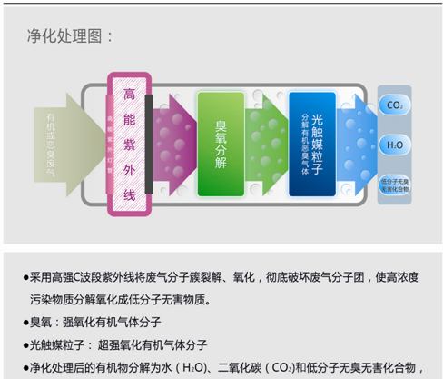 光觸媒粒子調到中(zhōng)間,分解有機惡臭氣體改成“分解惡臭物質”,臭氧分解調後,改成臭氧(yǎng)氧化。低分子改成小(xiǎo)分子(zǐ)。  下麵的小字(zì), 第(dì)一句,使高濃度汙染物質分解氧化成低分子無害(hài)物質,刪除。 )